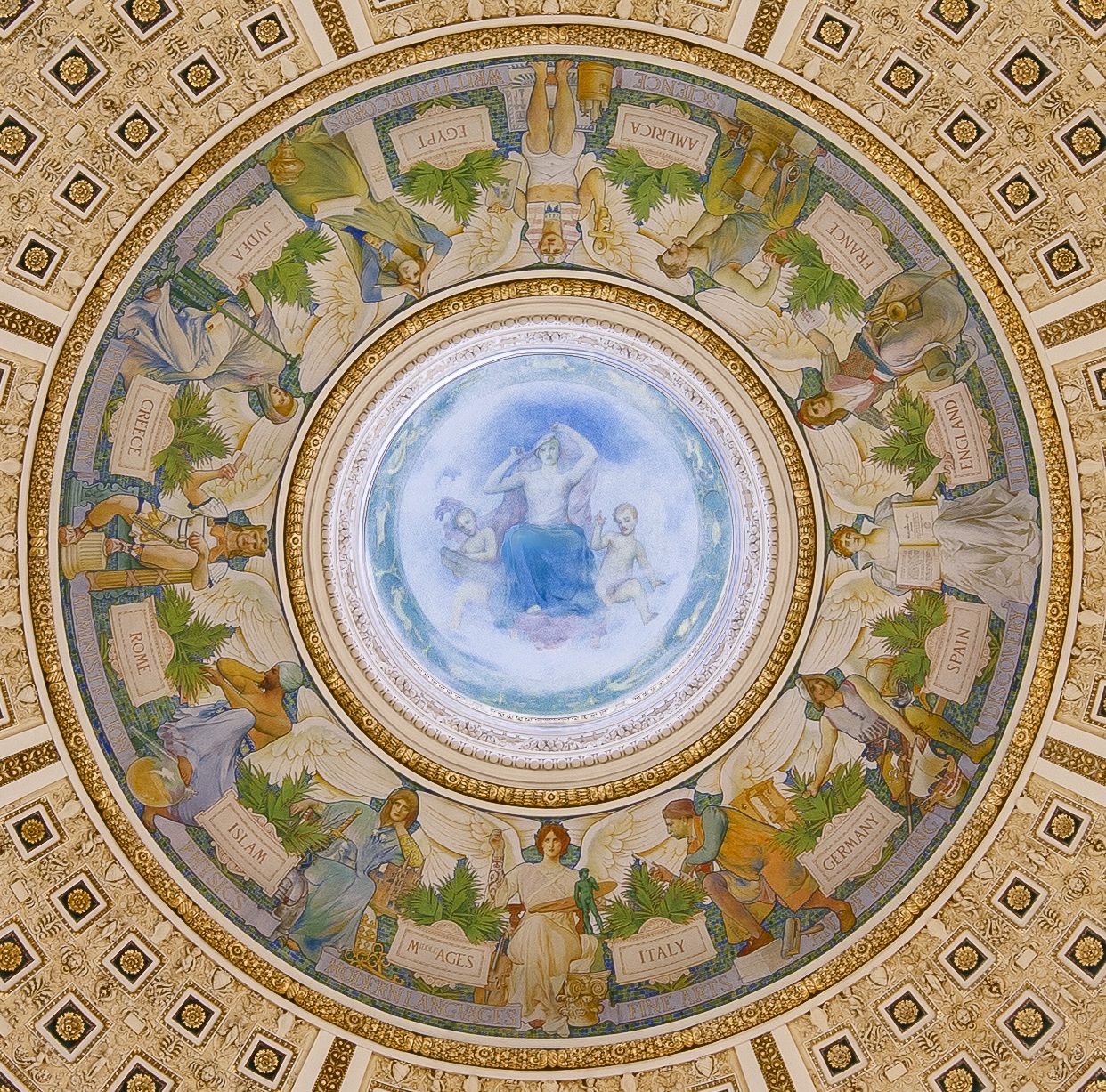 The Thomas Jefferson Building of the Library of Congress in Washington, D.C. features a large mural by Edwin Blashfield, Human Understanding, in the dome of the Main Reading Room. It represents lifting the veil of ignorance and looking towards intellectual progress. The twelve allegorical figures represent countries and epochs that contributed to Western civilization.
